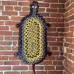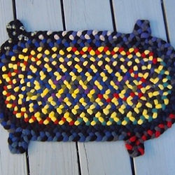 These continuously braided turtles are fun to braid! Roughly 12" wide and 24" long. The center is a basic oval mat and the head and feet get added in the last two rows. All the basics of braiding will be covered in this course with instructor Mary Hibbard.